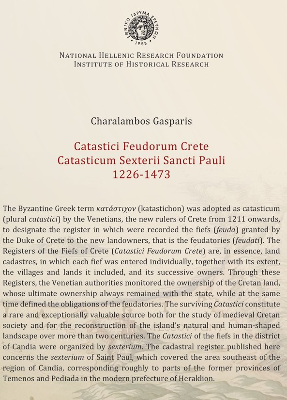 13 novembre 2025 Parution : Χαράλαπμος Γάσπαρης, Catastici Feudorum Crete. Catasticum Sexterii Sancti Pauli 1226-1473